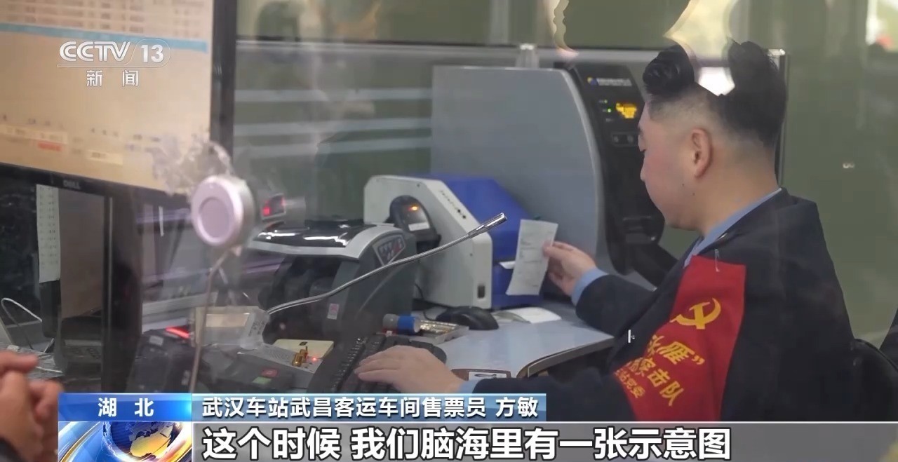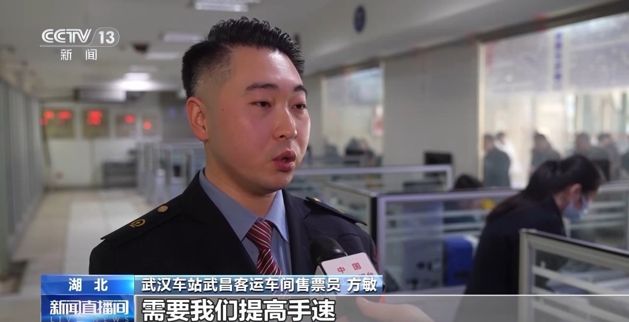 武汉车站武昌客运车间售票员 方敏:在平时工作中,尤其是大客流的时候,需要我们提高手速,有可能一天大客流要卖到500张票,平均最快的时候可能要10秒钟出一张票,满足旅客快速进站,不让他们在窗口排长队。